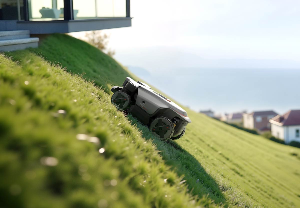 Der Roborock Rockmow Z1 bewältigt Steigungen bis 80 % (39°), überwindet Hindernisse bis 8 cm und passt sich mit Allradantrieb, patentierter aktiver Vorderradlenkung (Nullwendekreis) und Dynamic Suspension System optimal an unebenes Gelände an. Das schwebende Mähdeck sorgt für ein gleichmäßiges Schnittbild auch auf welligem Untergrund.